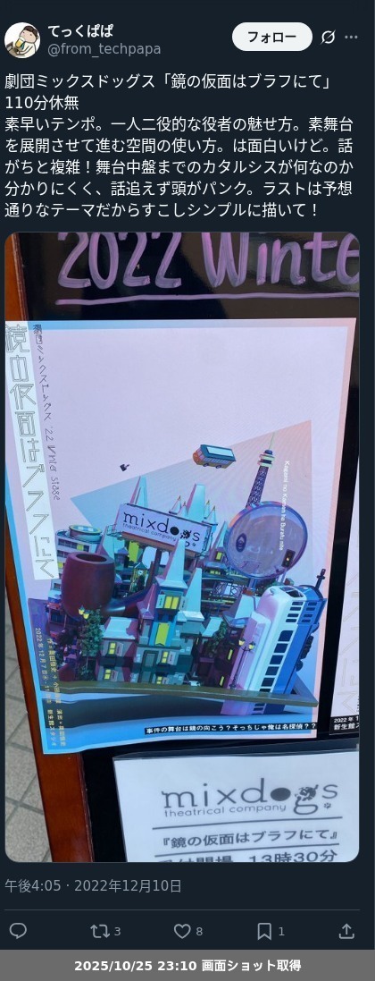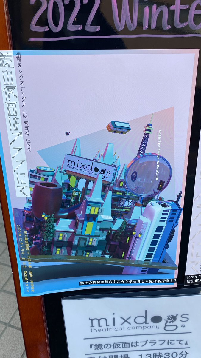 【ネタバレ分離】昨日観た芝居、 劇団ミックスドッグス「鏡の仮面はブラフにて」の観劇レポートです。