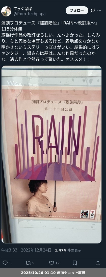 【ネタバレ分離】昨日観た芝居、 演劇プロデュース『螺旋階段』「RAIN~改訂版~」の観劇レポートです。