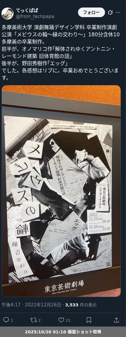 【ネタバレ分離】昨日観た芝居、 多摩美術大学 演劇舞踊デザイン学科「メビウスの輪〜縁の交わり〜」の観劇レポートです。