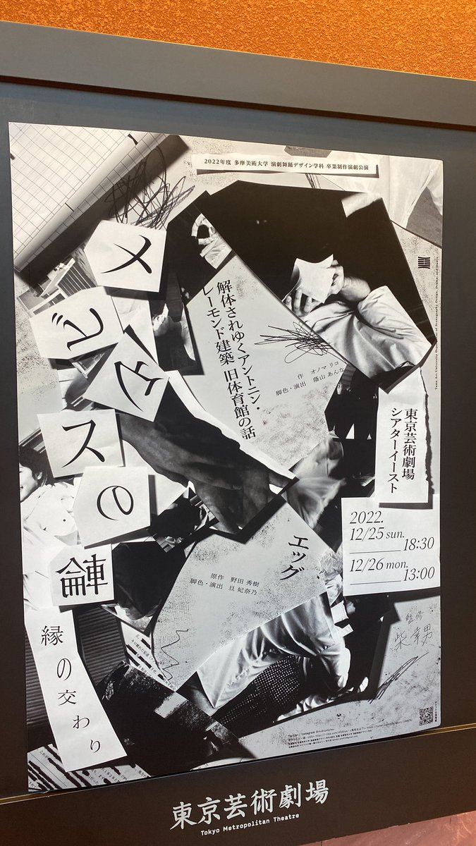 彼らの集団運営、創作の姿を見ていると、新しい時代が来ているのだと強く感じます。これまでのような権力構造からはなれて演劇はつくれる、と彼らは証明しようとしています。『メビウスの輪~縁の交わり~』と名付けられた本企画は2作品の同時上演という多摩美の演劇公演でも見たことのないものになりました。どちらも過去への対峙、忘却への抵抗、そして未来への創造を扱っていることは注目に値すると思います。上演が終わったときどのような景色が見えるのか。今から楽しみです。【上演作品】
