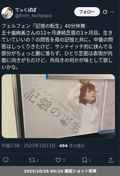| 観劇日時 | 2023年1月13日 14時00分〜 |