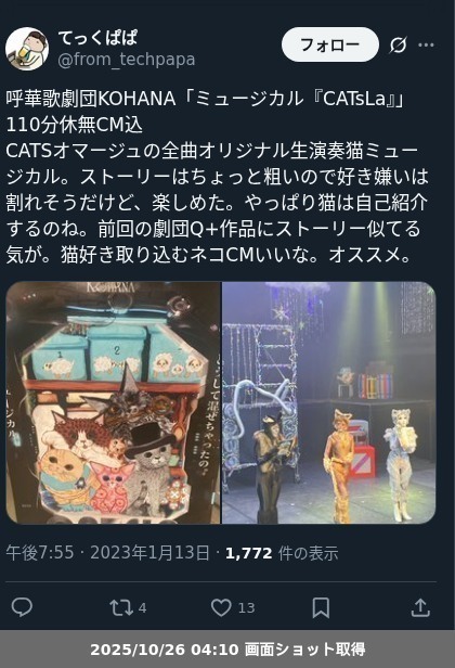 【ネタバレ分離】昨日観た芝居、 呼華歌劇団KOHANA「ミュージカル『CATsLa』」の観劇レポートです。