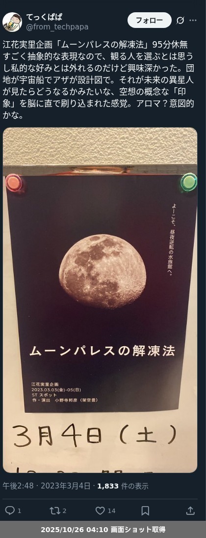 【ネタバレ分離】 江花実里企画「ムーンパレスの解凍法」の観劇レポートです。