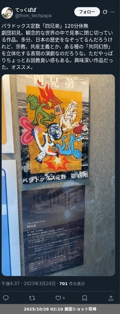 【ネタバレ分離】 パラドックス定数「四兄弟」の観劇レポートです。