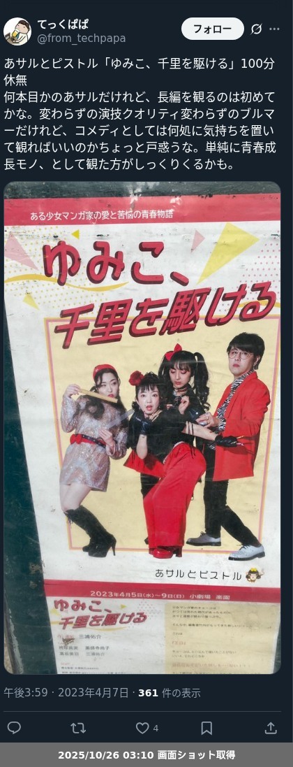 【ネタバレ分離】 あサルとピストル「ゆみこ、千里を駆ける」の観劇レポートです。