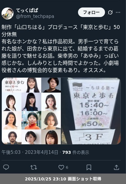 【ネタバレ分離】 制作「山口ちはる」プロデュース「東京と歩む」の観劇レポートです。