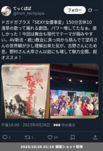 【ネタバレ分離】 劇団ドガドガプラス「SEXY女優事変」の観劇レポートです。
