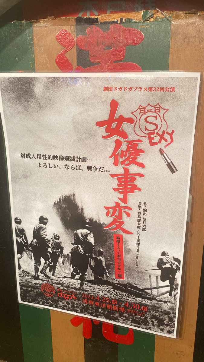17年目、浅草の劇団ドガドガプラス が今作は時代劇から現代劇への路線変更します。新型コロナ、ウクライナ侵攻、台湾・尖閣問題、その上人口問題を抱えた現代日本と向かい合いながらメチャメチャ笑い飛ばしていこう…そんな決心のもと、令和4年に可決した『アダルトビデオ新法』をOrigin of Ideaに生まれた新作が『セクシー女優事変-結婚するって本当ですか篇-』です。なお『セクシー女優事変』シリーズは以降『人妻死闘篇』『代償戦争』『絶頂作戦』『完結編』全5作を予定しています。