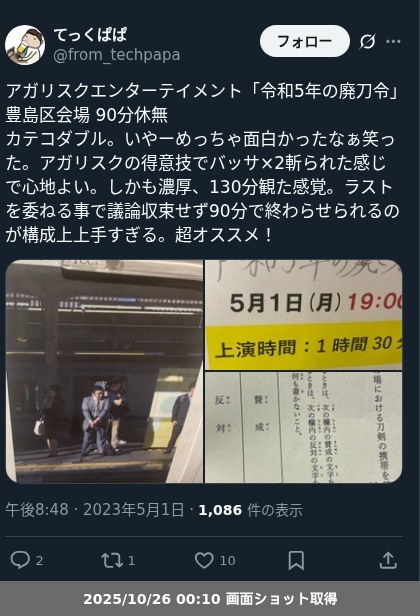 【ネタバレ分離】 Aga-risk Entertainment「令和5年の廃刀令」の観劇レポートです。