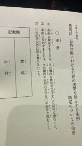 ストーリーは事前紹介の通り。としまくのホール施設(新しく出来たらしくてとても奇麗)で展開される「廃刀令」に関する公聴会。4~5月で3カ所で上演され、としま会場は最後の上演。70分くらい議論を展開してた後、あらかじめ当日パンフレットに挟まれている投票用紙で、観客に投票を呼び掛ける。投票箱を持った係の人が数名、客席を練り歩く方式。その投票結果を集計して、ラストの10分のは「賛成」か「反対」かで結末が変わる。私が観た回は「賛成」だったけれど、としま会場の3公演はすべて「賛成」だったらしい。