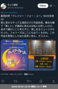 【ネタバレ分離】 劇団四季「クレイジー・フォー・ユー」の観劇レポートです。