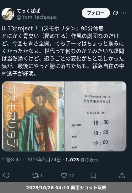 【ネタバレ分離】 U-33project「コスモポリタン」の観劇レポートです。