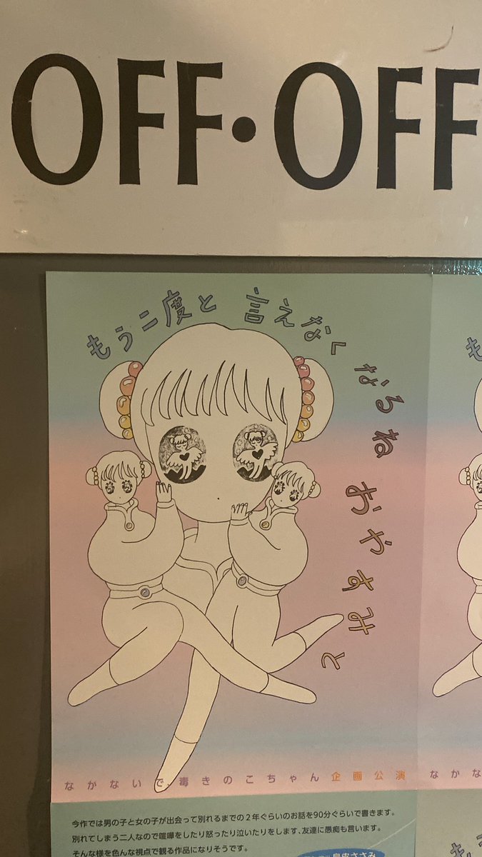 劇団の本公演ではなく、鳥皮ささみの自主企画。番外公演的な位置づけだろうか。スケジュール的に観れたのが丁度公開ゲネの回。劇団としても初めての試みだとの事。OFF OFFには珍しくまん中に花道を作っての対面客席の舞台。それもあって、観終わった後観難かった席がないか、などを積極的に問うていたのが印象的。