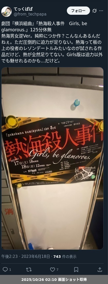 【ネタバレ分離】 劇団『横浜組曲』「『ザ・ロンゲスト・スプリング 熱海殺人事件』『熱海殺人事件 Girls, be glamorous.』」の観劇レポートです。