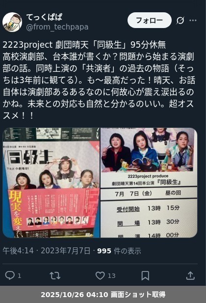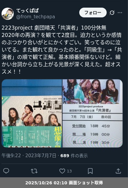 【ネタバレ分離】 2223project 劇団晴天「共演者/同級生」の観劇レポートです。