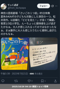 コロナ後、マスク必須でないのが許される状態で、プログラムが本格的に再会した、最初の演目、というのもあるのだろうか。リスクを抑えつつも、客席に積極的に語りかけたり、客側に声を出すように演出が組まれているのが印象的。仮に上演時に、コロナが再度流行って制約がかかる可能性を考慮して、いろいろなパターンが取れるように模索しているようも感じる。隣にたまたま座った小学生も含め、声を出したり、手を叩いたり、足踏みしたり。楽しんでいた様子が印象的。