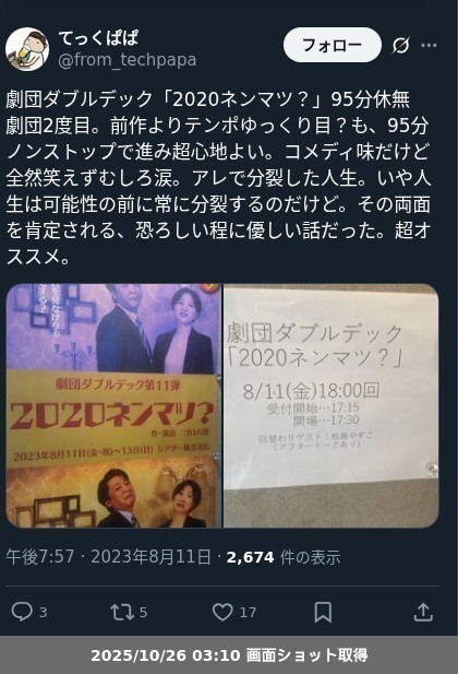 カーテンコール。最近よく見かける、流行りの「あよはじょうず。」方式か・・・と思ったものの。感想を書く特典で頂いた、初演の「ピンポンしょうじょ→」のDVDを帰宅して見たら、同じようなカーテンコール挨拶。この作品2014年の作品だから、こちらが源流なのか・・・あるいはそもそも源流なんてないのか。