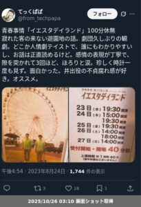 劇団久しぶり。前回観た作品があまり合わなくて敬遠していたけれど、別団体で観た大野ユウジの作品が面白くて再度チャレンジ。寂れた遊園地の群像劇。お話は正直、途中で先が読み切れてしまったし、何か目新しいものがあったっていう感覚は無かったのだけれど。人情劇っぽく描かれる感情、特に登場人物の1:1の感情が丁寧で、観ていて飽きない。結局私には珍しく、時計を観ずに観劇。