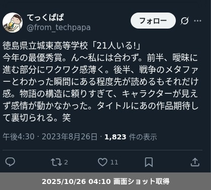 1970年代位の短編海外ドラマだと割とありがちな種明かしな気もして、妙な古くささも感じる。あるいは当事者視点の映画「クローバーフィールド」みたいなものとして考えると、そこに生きているキャラクターがイキイキしていないと、戦争がある事の哀しみ、みたいなものも描けないように思う。最優秀賞なので、鹿児島の全国大会での映像がNHKでテレビ放映される。聞くところによると、鹿児島総文では「神上演」と言われたようなのて、今回の観劇とどの程度印象が違うのか見比べたい。