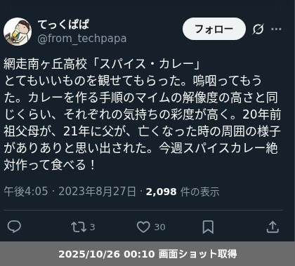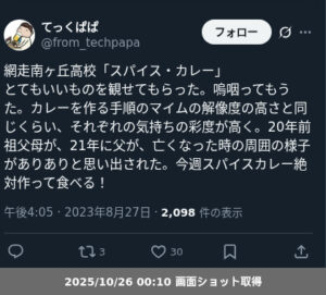 | 4 | 北海道網走南ケ丘高等学校 | スパイス・カレー | 網走南ケ丘高校演劇部・新井繁 | 27日15:00頃~ |