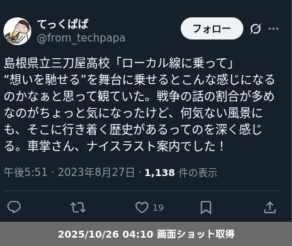 | 5 | 島根県立三刀屋高等学校 | ローカル線に乗って | 亀尾佳宏 | 27日16:00頃~ |