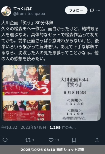| 観劇日時 | 2023年09月08日 14時00分〜 |
