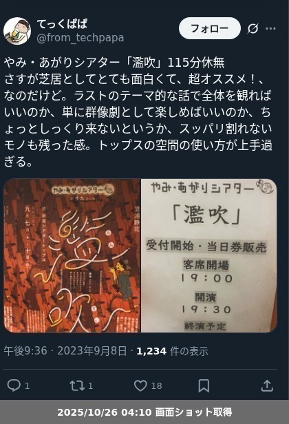 | 観劇日時 | 2023年09月08日 19時30分〜 |