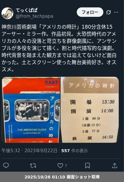 【ネタバレ分離】 KAAT神奈川芸術劇場「アメリカの時計」の観劇レポートです。