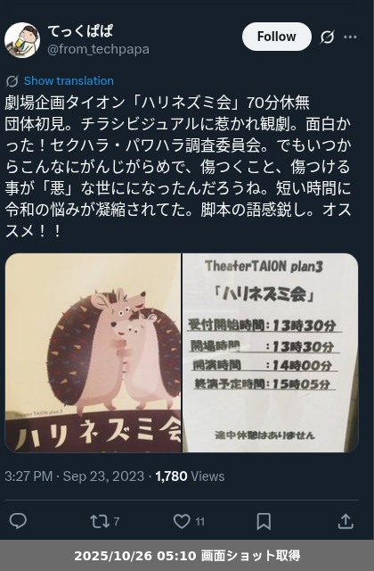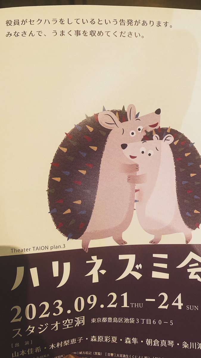 【ネタバレ分離】 劇場企画タイオン「ハリネズミ会」の観劇レポートです。