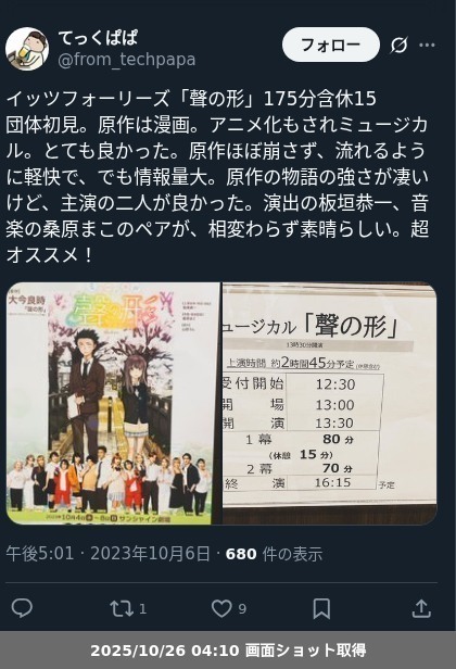 | 観劇日時 | 2023年10月06日 13時30分〜 |