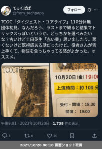 | 観劇日時 | 2023年10月20日 19時00分〜 |