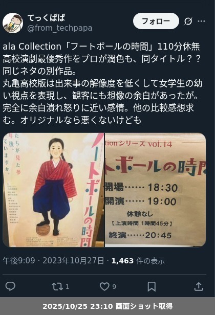 その後知ったが、原作の作者も、この作品を支持しているようなので、私自身は「フートボールの時間」という作品は、もう何が真なのか分からない。こんな作品、無かったことするしかない、と思っている。カーテンコールを拒否して怒りに任せて退場した舞台は久しぶりだった。