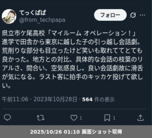 | 1 | 県立市ケ尾高校 | マイルーム オペレーション! | 作:山浦邦宏 | 10/27 10:00~ |