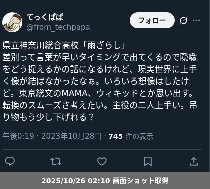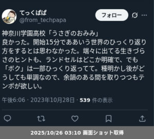 | 2 | 県立神奈川総合高校 | 雨ざらし | 作:立原嶺佳 佐野佑紀稠色 | 10/27 11:20~ |