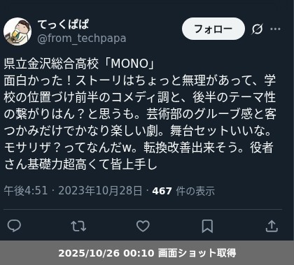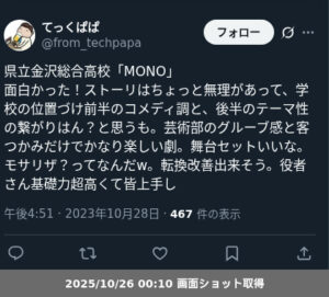 | 5 | 県立金沢総合高校 | MONO | 作:佐藤花菜 | 10/27 15:50~ |