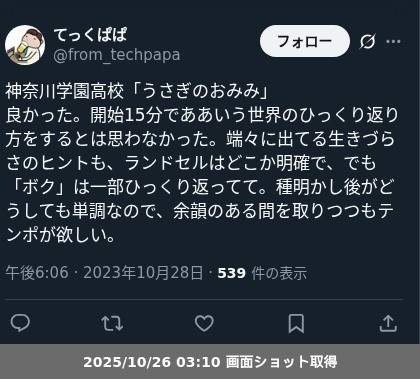 最初の15分で、そう来たか、という感覚。世界観が、180度ひっくり返るのがとても面白い。その後、耳をしたくない子は、回想シーンで黒いランドセルをしょっているし、いやいや付けているうさぎの耳も灰色。物語前提には、様々な偏見や差別へのメタファーが散りばめられているのだろうけれど、おそらく性同一性の問題、ジェンダーの問題、と考えると、しっく理解できるように創られているようにも見える。ラストのくだりで「耳をつけなくても変じゃない星がどこかにないかなぁ」と空を見上げるのが、この話は実は地球じゃない別の場所の話なんじゃないか・・・遠く離れた星の人も、地球のジェンダー問題のような同じ切なさを抱えているのかなぁ、なんていう事を想像すると、何だかとても切なくなってしまった。