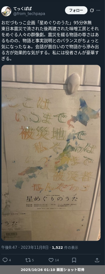 実際に南三陸町で活動している団体故、震災の描写だったり、その街の人々が創った演劇という意味では、尊いものなのだろうと思う。写真の洗浄作業は、映画「浅田家」でも取り上げられていたし、他にも、実際のエピソードを基にしているのがあるもしれない・・・という場面が多々あり、胸に込み上げるものがあるものの。