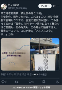私自身、大会で二つの学校が合同で公演するのを観るのは初めて。確か少し前に高校演劇の規定が改定になって、二つの部活が合同で作品を発表することが許されるようになった・・・んだと思う(うろ覚え)。二校合同の公演。