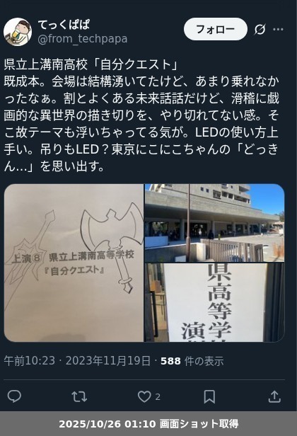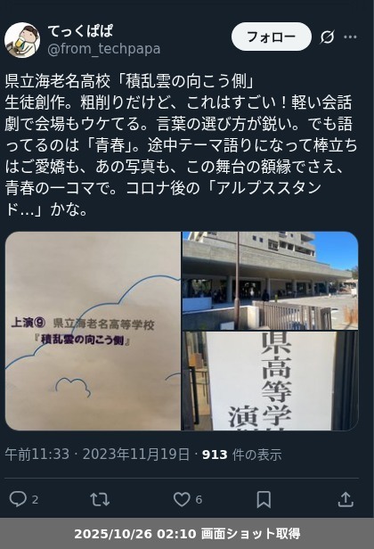 生徒創作。粗削りだけど、これはすごい!軽い会話劇で会場もウケてる。言葉の選び方が鋭い。でも語ってるのは「青春」。途中テーマ語りになって棒立ちはご愛嬌も、あの写真も、この舞台の額縁でさえ、青春の一コマで。コロナ後の「アルプススタンド…」かな。