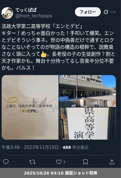 キター!めっちゃ面白かった!手叩いて爆笑。エンとデビそういう事ネ。世の中偽善だけで通すとロクなことないぞってのが物語の構造の根幹で、説教臭さなく頭に入って👍。長老役の子の生徒創作?割と天才作家かも。舞台十分持ってるし音楽半分位不要かも。バルス!