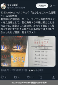 【ネタバレ分離】 2223project「おかしな二人~女性版~」の観劇レポートです。
