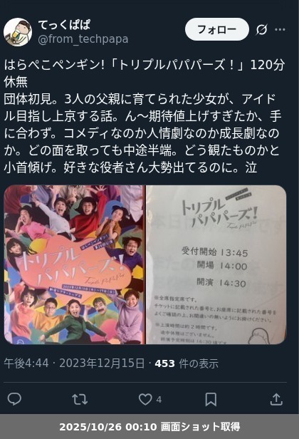【ネタバレ分離】 はらぺこペンギン!「トリプルパパパーズ!」の観劇レポートです。