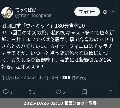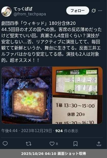 真瀬グリンダと小林エルファバの組み合わせ来たっ。予想通りのハマり具合で、私にとっては今期の「ウィキッド」はこのキャストがベストなんではないかと思う。真瀬さんのグリンダが、とにかく一つ一つのセリフが丁寧で、受け答えに不自然さが無く、しかも新しい解釈を吹き込んでくれる。良すぎて、異化な視点・・・俺なんでこの作品こんなに好きなんだろう・・・みたいな事を、観劇中についつい冷静に考えてしまった。