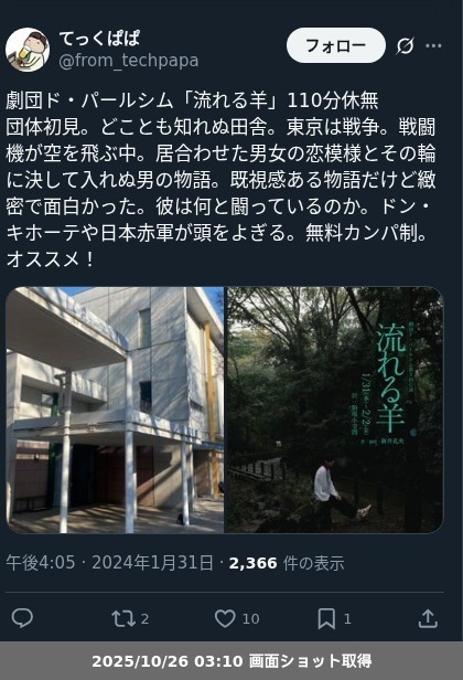 【ネタバレ分離】 劇団ド・パールシム「流れる羊」の観劇レポートです。