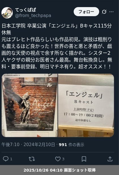 【ネタバレ分離】日本工学院専門学校 卒業公演「エンジェル」の観劇レポートです。