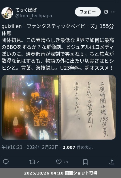 【ネタバレ分離】 guizillen「ファンタスティックベイビーズ」の観劇メモです。