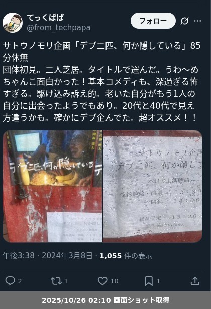 【ネタバレ分離】 サトウノモリ企画「デブ二匹、何か隠している」の観劇メモです。