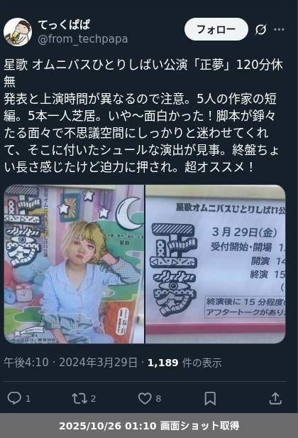 【ネタバレ分離】 星歌オムニバスひとりしばい公演「正夢」の観劇メモです。