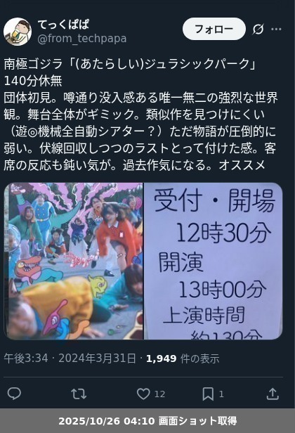 【ネタバレ分離】 南極ゴジラ「(あたらしい)ジュラシックパーク」の観劇メモです。