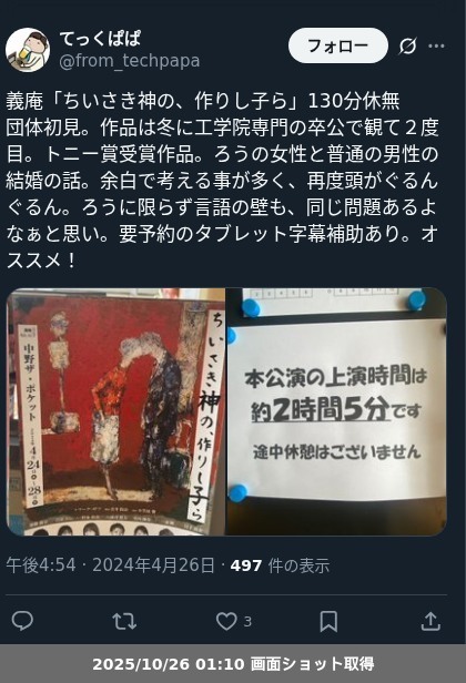 団体初見。作品は冬に工学院専門の卒公で観て2度目。トニー賞受賞作品。ろうの女性と普通の男性の結婚の話。余白で考える事が多く、再度頭がぐるんぐるん。ろうに限らず言語の壁も、同じ問題あるよなぁと思い。要予約のタブレット字幕補助あり。オススメ!